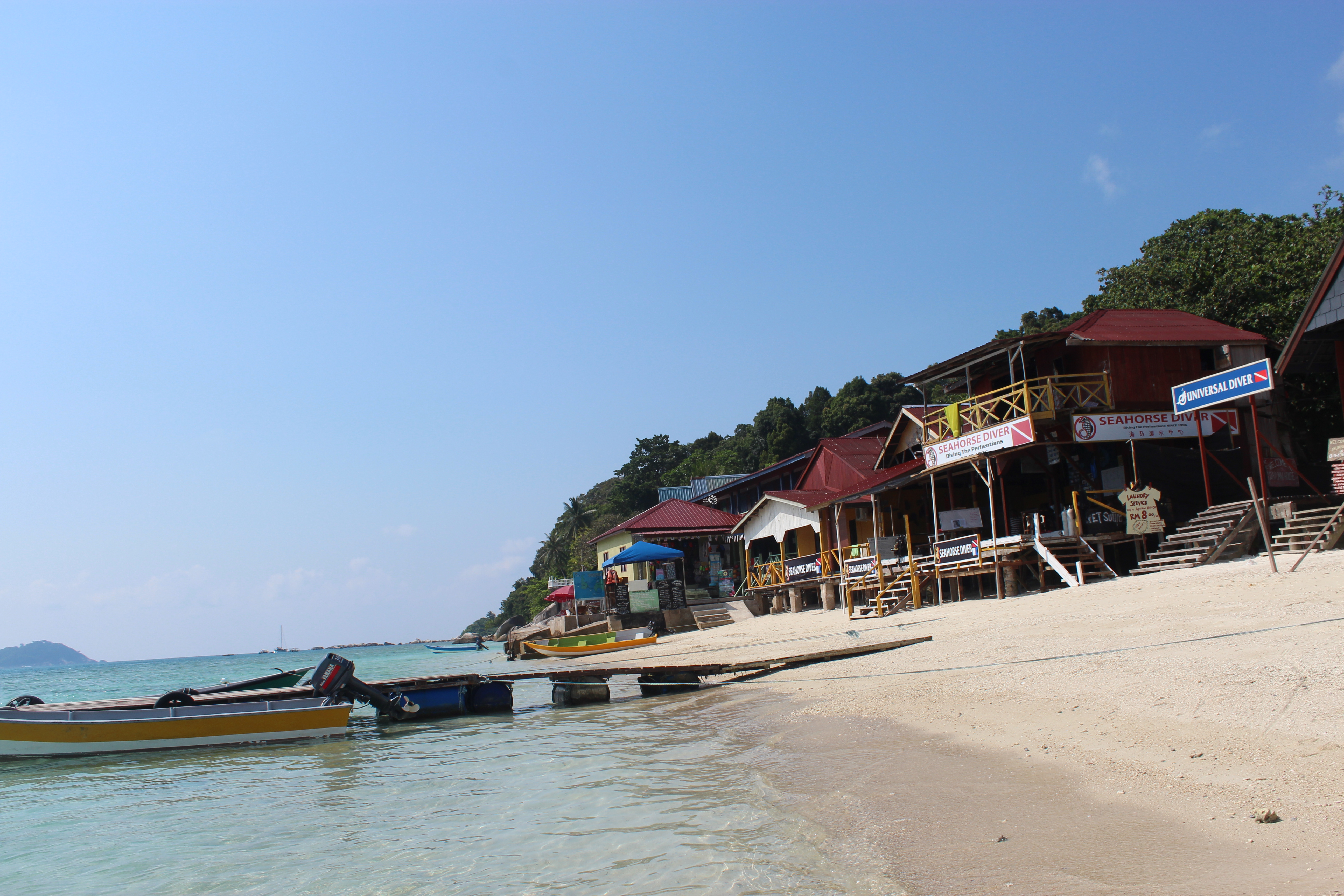 The only thing that interrupted a second day of snorkelling, sleeping, reading and generally bludging was a necessary trip to the other island – the BIG ISLAND, also known as Besar – to get some money out. It wasn’t much of a hassle really, and was quite a bit of fun. I returned to the fishing village, marveling again at their carefree lifestyle, then took a tiny boat across the two kilometres to the other island. The water here was truly wonderful – so bright and blue and clear that my brain had trouble registering that it was actually real.