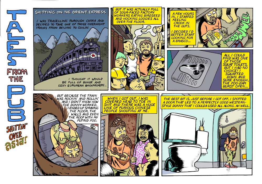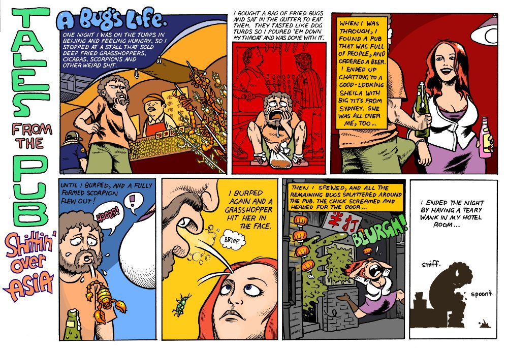 A few years ago I went on an epic journey through China, Malaysia and Brunei. I almost fell off the Great Wall, got into a fight with violent Hong Kong kung-fuists and passed out under more palm trees than you’ve had hot dinners. When the proud people of these wonderful Oriental nations finally decided they’d had enough of me and sent me back to Australia, I got some bloke with a pencil to draw up a few comic strips about my wacky adventures. They appeared in wank rag The Picture and really captured what the Drunk and Jobless World Tour is all about. Enjoy my rice wine-soaked awesomeness in animated form. I’m like a fucking Marvel superhero, so go fuck yourself Chris Hemsworth!